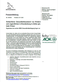 In den letzten vier Jahren, die von weltweiten Krisen wie der Corona-Pande-mie, dem Ukrainekrieg und der Energiekrise geprägt waren, hat sich der Ge-sundheitszustand von Brandenburgs Kindern und Jugendlichen subjektiv verschlechtert. Das ist das Ergebnis der zweiten sogenannten HBSC-Studie („Health Behaviour in School-aged Children“), die jetzt veröffentlicht wird.